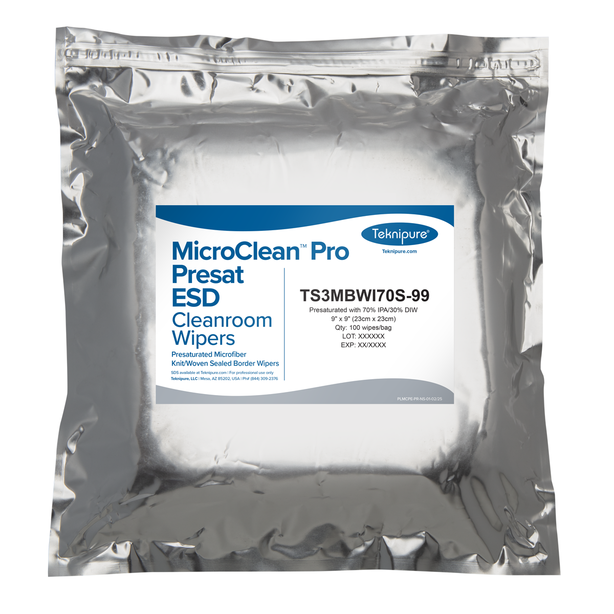 Teknipure’s MicroClean™ Pro Presat ESD microfiber woven cleanroom wipers with sealed border, presaturated with 70% IPA and 30% DI water, are designed for ultra-clean performance in critical environments that demand low-linting, low-shedding, and highly absorbent wiping solutions. Engineered from polyester and nylon microfiber blend, these knit/woven pre-wetted wipes provide exceptional particle pick-up and surface cleaning without introducing contamination.