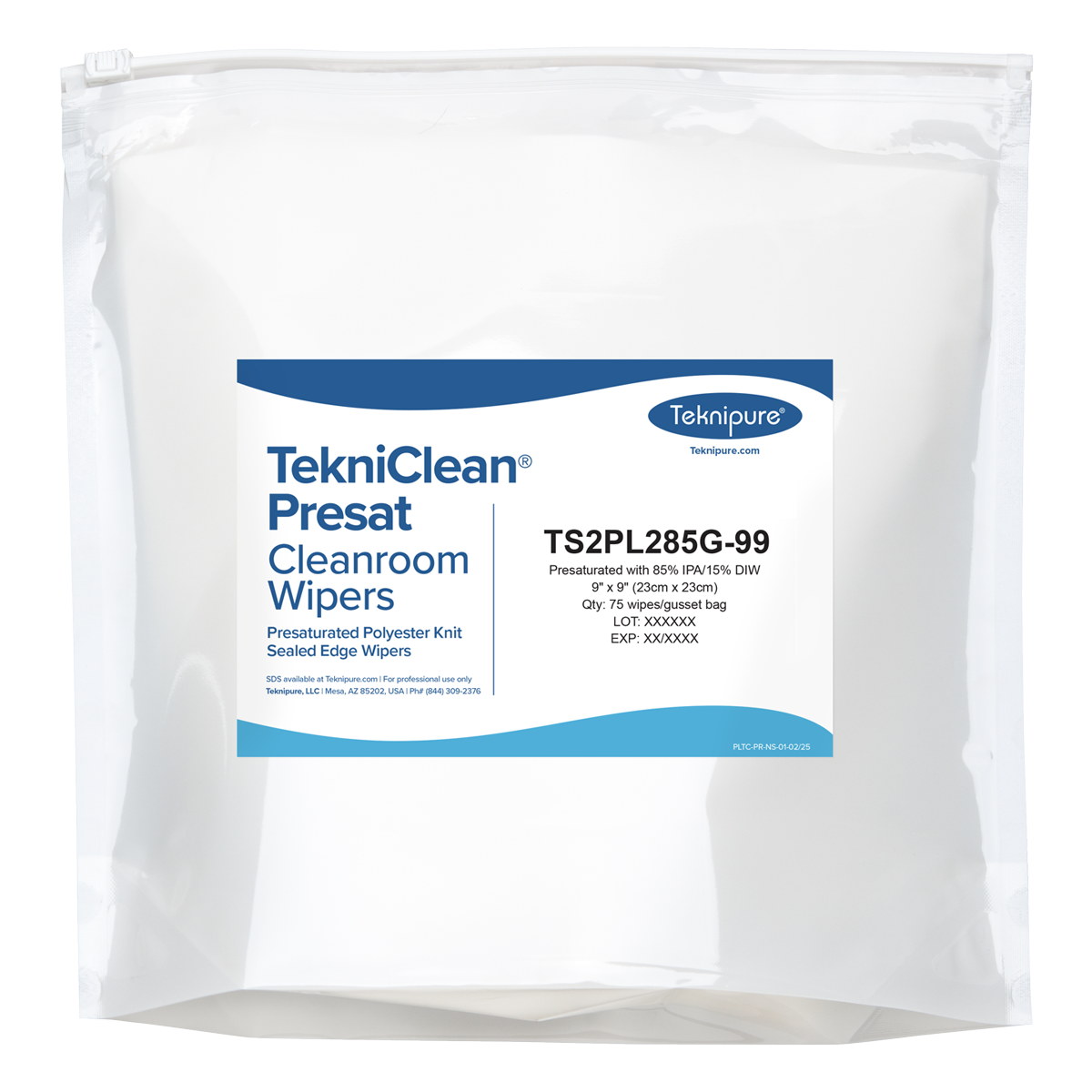Teknipure’s TekniClean® Presat polyester knit cleanroom wipers with sealed edges, presaturated with 70% isopropyl alcohol / 30% DI water, are designed for ultra-clean performance in critical environments that demand low-linting, low-shedding, and highly effective wiping solutions. Engineered from polyester material, these knit wipes provide great particle pick-up and surface cleaning.