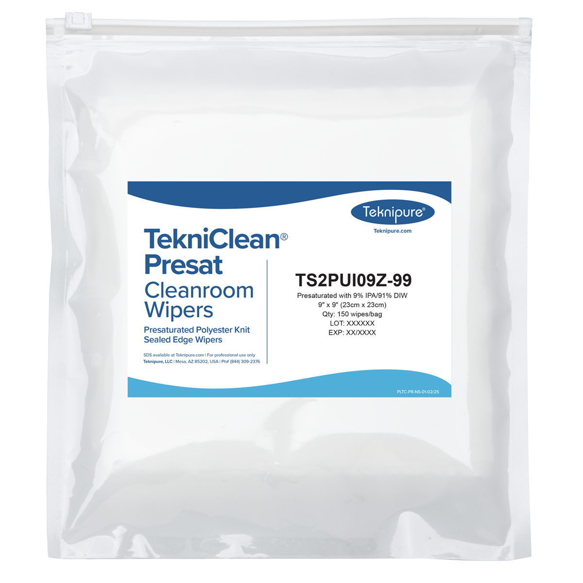 Teknipure’s Polyester knit wipers with sealed edge are available dry (TekniClean®) and presaturated (TekniClean® Presat). Available pre-saturated with 6%, 9%, 10%, 70%, 85%, 99% and 100% IPA, sterile and non-sterile.