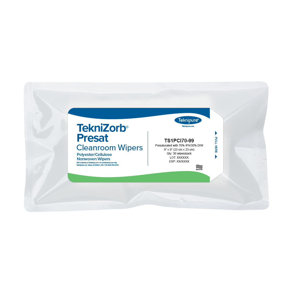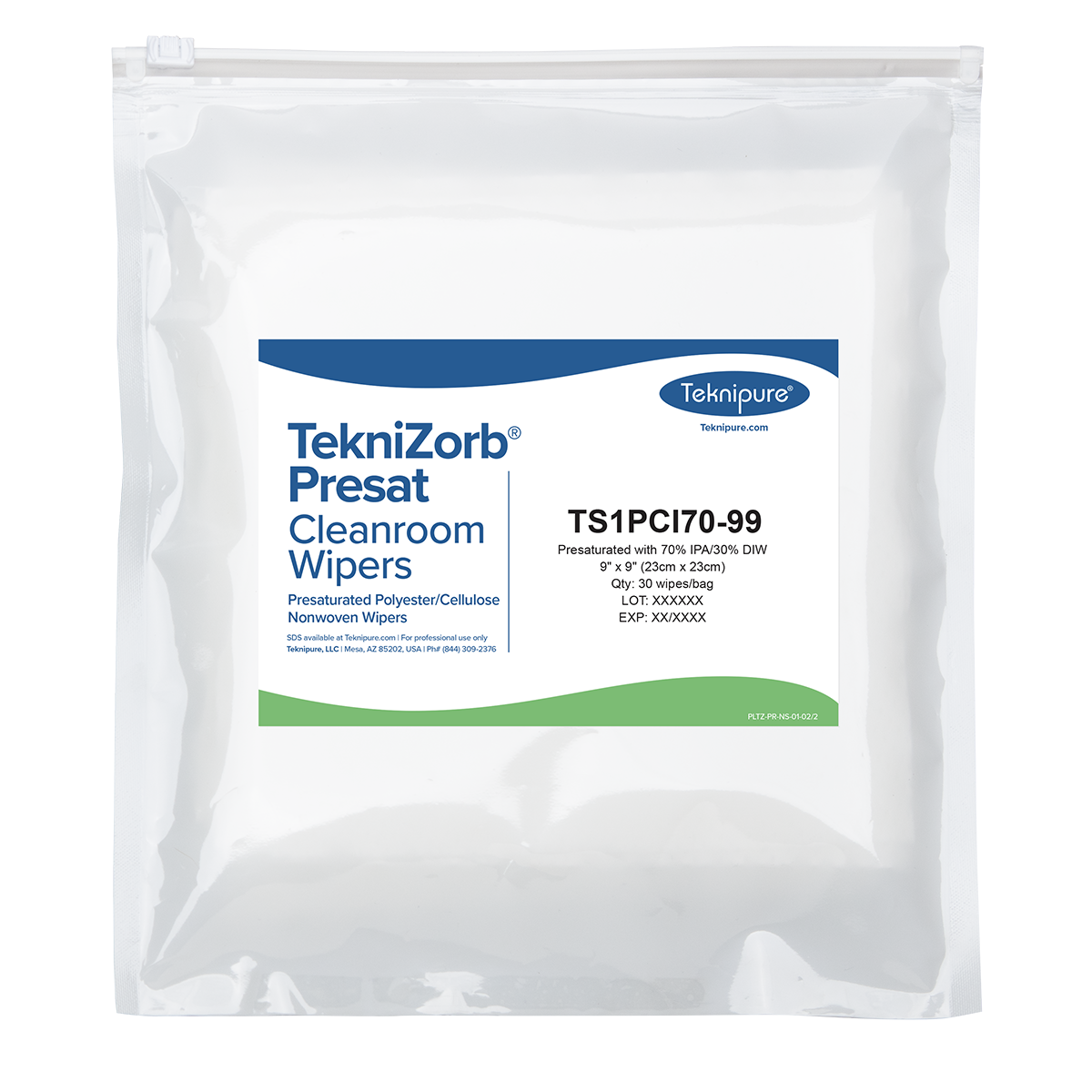 Teknipure’s TekniZorb® Presat presaturated 70% IPA polyester/cellulose nonwoven cleanroom wipers are engineered for precision cleaning in controlled environments. These low-lint, polycell nonwoven wipes are saturated with 70% isopropyl alcohol / 30% DI water blend, making them ideal for removing contaminants, residues, and particles from surfaces in cleanrooms, pharmaceutical manufacturing, semiconductor fabrication, biotech labs, and medical device production.